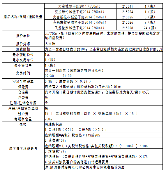 大宝城堡干红2014(750ml)克拉米伦城堡干红2014(750ml)史密斯拉菲城堡干红2014(750ml)等酒品挂牌上市公告
