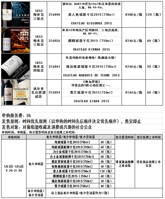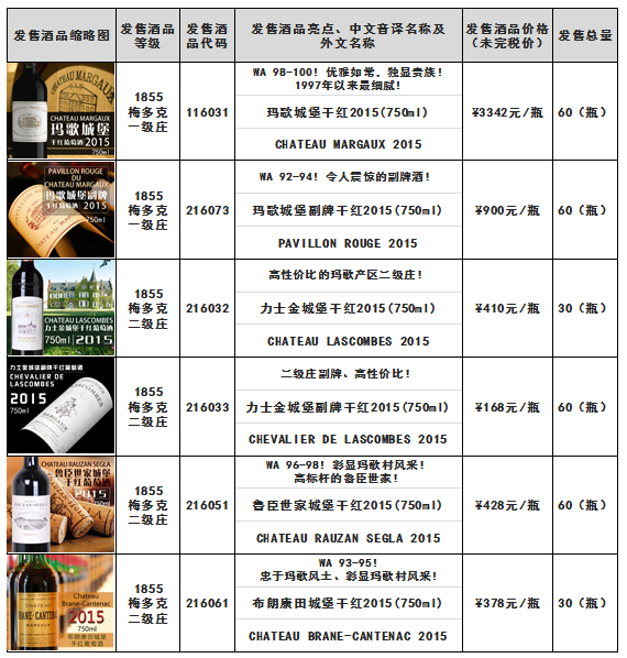 玛歌城堡干红2015(750ml) 力士金城堡干红2015(750ml) 鲁臣世家城堡干红2015(750ml)等酒品发售公告