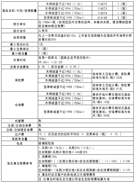 木桐城堡干红1982(1.5L)木桐城堡干红1994(750ml)木桐城堡干红1996(750ml)宝得根城堡干红1995(750ml)酒品挂牌上市公告