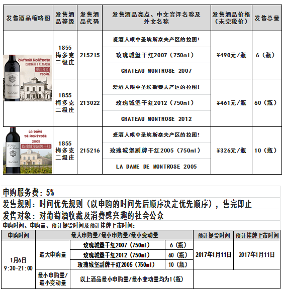 玫瑰城堡干红2007(750ml)玫瑰城堡干红2012(750ml)玫瑰城堡副牌干红2005(750ml)酒品发售公告