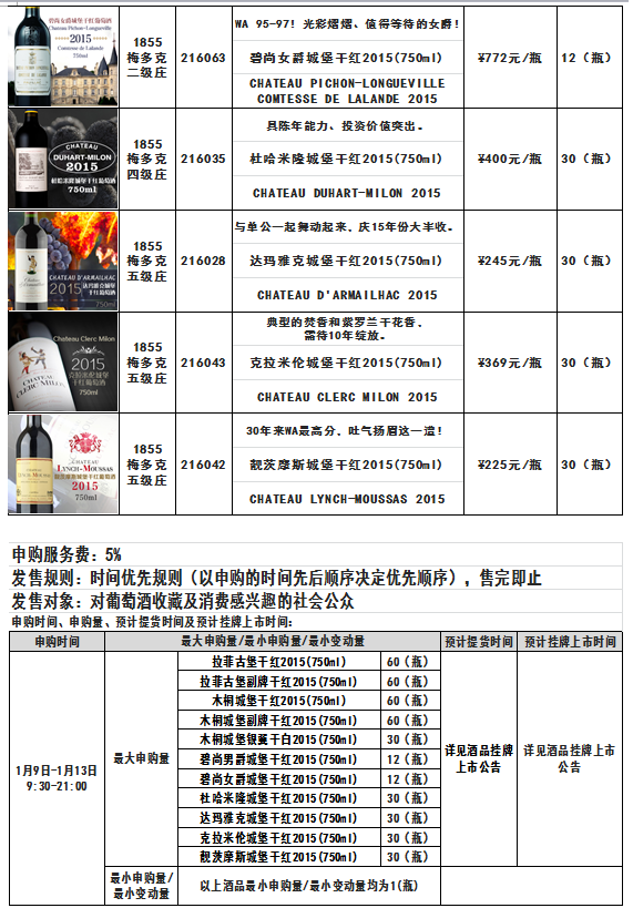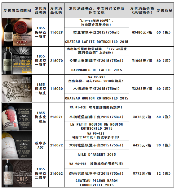 拉菲古堡干红2015(750ml) 木桐城堡干红2015(750ml) 碧尚男爵城堡干红2015(750ml)等酒品发售公告