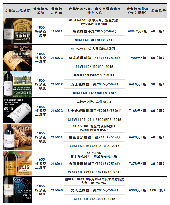 关于玛歌城堡干红2015(750ml)-酒品代码:116031力士金城堡干红2015(750ml)-酒品代码:216032等酒品结束发售的通知