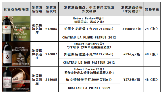 根据《柏翠之花城堡干红2012(750ml)邦巴斯德城堡干红2012(750ml)柏安特城堡干红2009(750ml)酒品发售公告》,本次发售的柏翠之花城堡干红2012(750ml)-酒品代码:216086邦巴斯德城堡干红2012(750ml)-酒品代码:216087等酒品(详见下述列表)于1月9日21时00分全部发售结束。