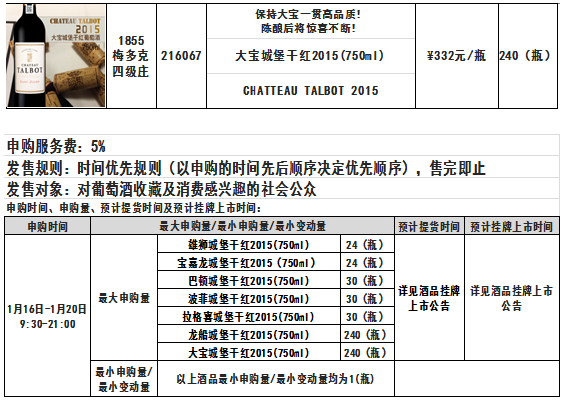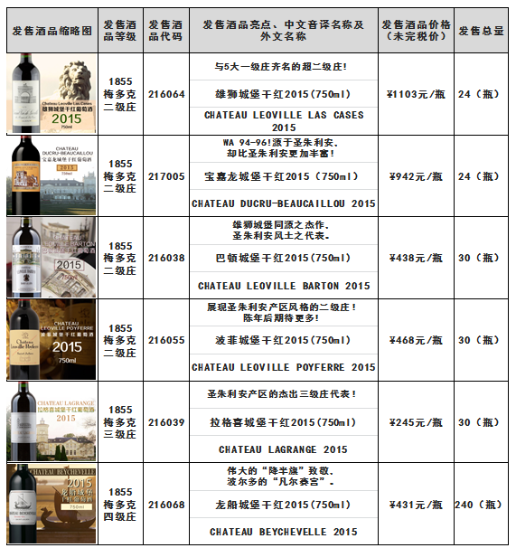 雄狮城堡干红2015(750ml) 宝嘉龙城堡干红2015(750ml)巴顿城堡干红2015(750ml)等酒品发售公告