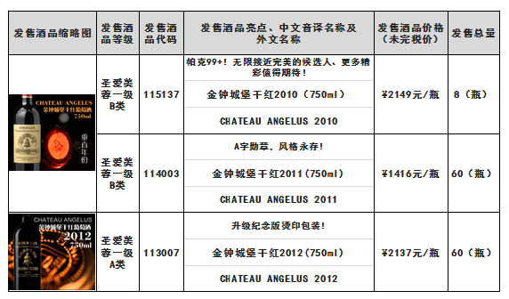 根据《金钟城堡干红2010(750ml)金钟城堡干红2011(750ml) 金钟城堡干红2012(750ml)酒品发售公告》,本次发售的金钟城堡干红2010(750ml)-酒品代码:115137金钟城堡干红2011(750ml)-酒品代码:114003等酒品(详见下述列表)于1月13日21时00分全部发售结束。