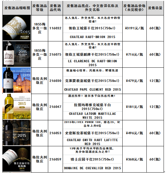 根据《侯伯王城堡干红2015(750ml)克莱蒙教皇城堡干红2015(750ml)拉图玛蒂雅克城堡干红2015(750ml)等酒品发售公告》,本次发售的拉图玛蒂雅克城堡干红2015(750ml)-酒品代码:216046酒品截止于2月28日16时18分发售结束。