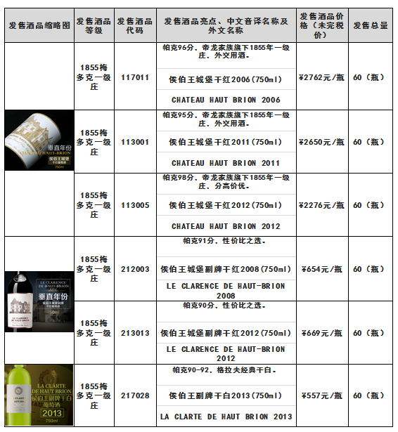 侯伯王城堡干红2006(750ml)修道院城堡干红2005(750ml)昆图斯城堡干红2014(750ml)等酒品发售公告发售声明 本发售公告的目的仅为向公众提供有关本次发售的基本情况,发售公告...