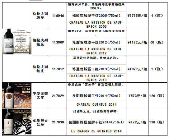 根据《侯伯王城堡干红2006(750ml)修道院城堡干红2005(750ml)昆图斯城堡干红2014(750ml)等酒品发售公告》,本次发售的侯伯王城堡干红2006(750ml) -酒品代码117011、修道院城堡干红2005(750ml) -酒品代码116046、昆图斯城堡干红2014(750ml) -酒品代码217029等酒品(详见下述列表)于3月3日21时00分全部发售结束。