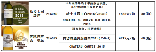 根据《侯伯王城堡干红2015(750ml)克莱蒙教皇城堡干红2015(750ml)拉图玛蒂雅克城堡干红2015(750ml)等酒品发售公告》,本次发售的侯伯王城堡干红2015(750ml)-酒品代码:116032、侯伯王城堡副牌干红2015(750ml)-酒品代码:216075等酒品(详见下述列表)于3月3日21时00分全部发售结束。