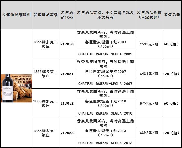 鲁臣世家城堡干红2003(750ml)、大炮城堡干红2006(750ml)等酒品发售公告 上海自贸区红酒交易中心 发售声明 本发售公告的目的仅为向公众提供有关本次发售的基本情况,发售公告全文同...