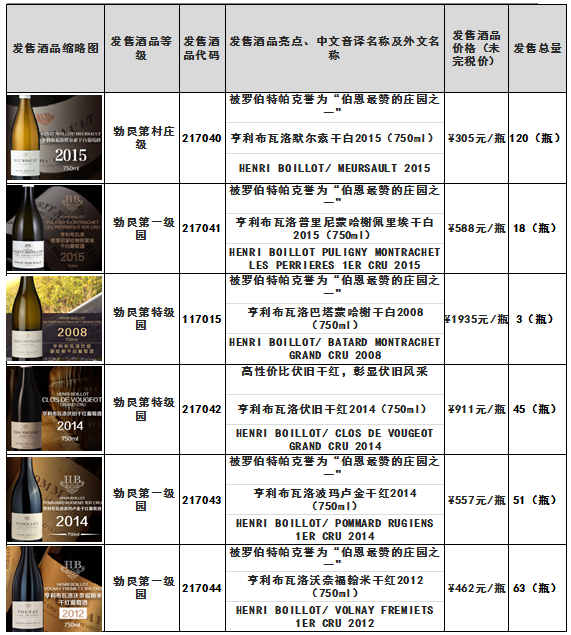 关于亨利布瓦洛默尔索干白2015(750ml)-酒品代码217040、约瑟夫杜鲁安柯登干红2012(750ml)-酒品代码217046、阿杰特夏布利一级园老藤干白2014 (750ml)-酒品代码217049等酒品结束发售的通知