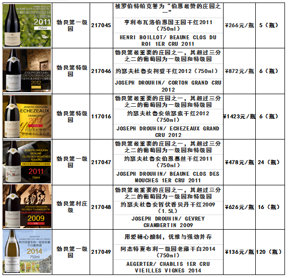 关于亨利布瓦洛默尔索干白2015(750ml)-酒品代码217040、约瑟夫杜鲁安柯登干红2012(750ml)-酒品代码217046、阿杰特夏布利一级园老藤干白2014 (750ml)-酒品代...