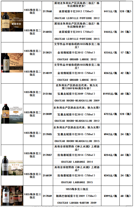 关于滴金城堡贵腐甜白80年代套装(750ml*6)-酒品代码317009、白马城堡干红1999(750ml)-酒品代码117022、朗贝雷酒庄干红2013(750ml)-酒品代码116090等酒...