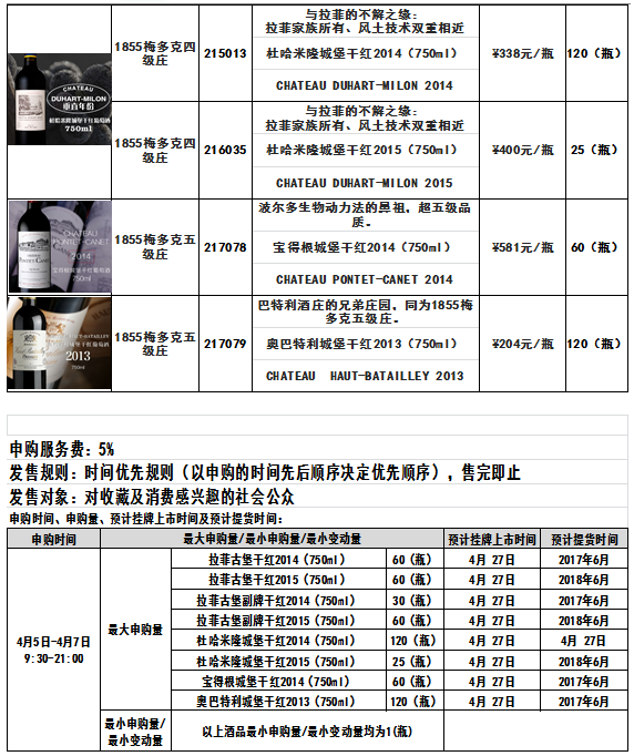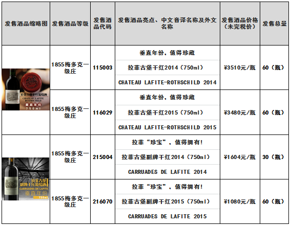 拉菲古堡干红2014(750ml)、杜哈米隆城堡干红2014(750ml)等酒品发售公告