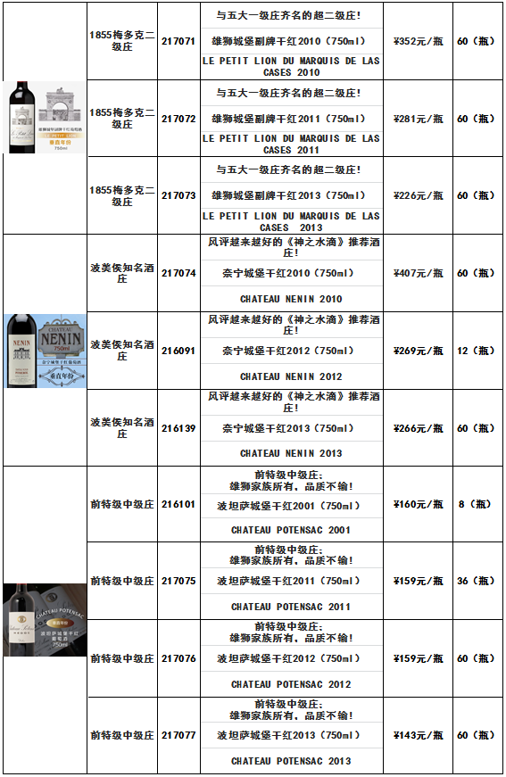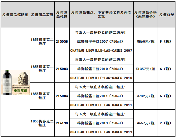 根据《雄狮城堡干红2007(750ml)、奈宁城堡干红2010(750ml)、波坦萨城堡干红2001(750ml)等酒品发售公告》,本次发售的雄狮城堡干红2007(750ml)-酒品代码215058、奈宁城堡干红2010(750ml)-酒品代码217074等酒品(详见下述列表)于3月31日21时00分全部发售结束。