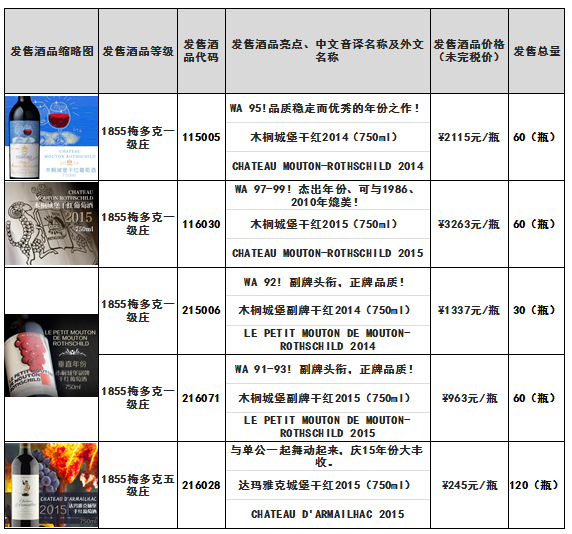 根据《木桐城堡干红2014(750ml)、达玛雅克城堡干红2015(750ml)等酒品发售公告》,本次发售的木桐城堡干红2014(750ml)-酒品代码115005、达玛雅克城堡干红2015(750ml)-酒品代码216028等酒品(详见下述列表)于4月14日21时00分全部发售结束。