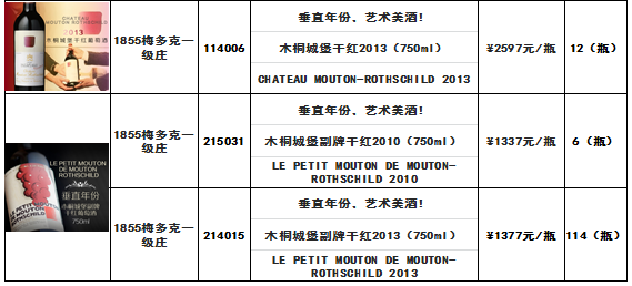 根据《木桐城堡干红2005(750ml)、达玛雅克城堡干红2012(750ml)等酒品发售公告》,本次发售的木桐城堡干红2005(750ml)-酒品代码117033、达玛雅克城堡干红2012(750ml)-酒品代码213012等酒品(详见下述列表)于4月14日21时00分全部发售结束。