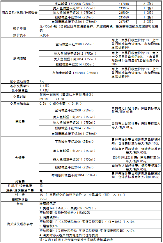 宝马城堡干红2008(750ml)、美人鱼城堡干红2012(750ml)等酒品挂牌上市公告