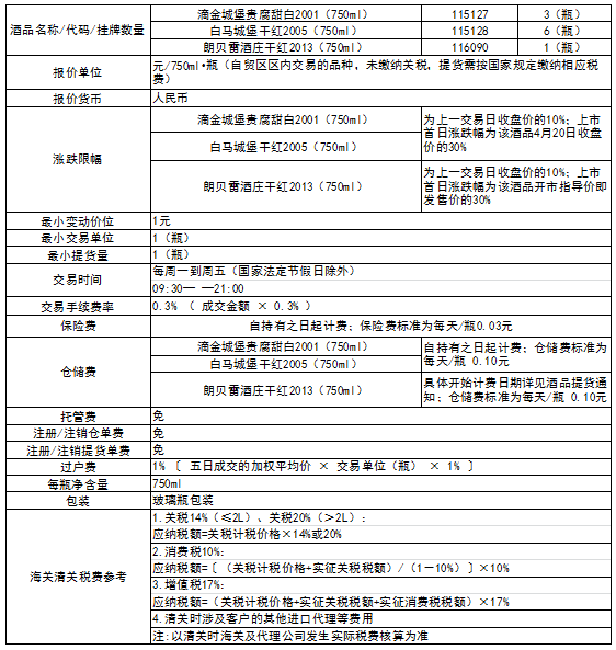 滴金城堡贵腐甜白2001(750ml)、白马城堡干红2005(750ml)等酒品挂牌上市公告