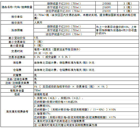 根据 《雄狮城堡干红2007(750ml)、奈宁城堡干红2010(750ml)、波坦萨城堡干红2001(750ml)等酒品发售公告》,本次发售雄狮城堡干红2010(750ml)、奈宁城堡干红2012(750ml)等酒品于2017年3月31日发售结束; 2017年 4月 24日在本平台挂牌上市交易。