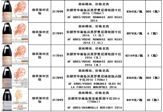 根据《安娜芳华葛鲁依瑟索干红2015(750ml)、安娜芳华葛鲁依瑟索干红2016(750ml)等酒品发售公告》,本次发售的安娜芳华葛鲁依瑟索干红2015(750ml)-酒品代码116033、安娜芳华葛鲁依瑟索干红2016(750ml)-酒品代码117036等酒品(详见下述列表)于4月21日21时00分全部发售结束。