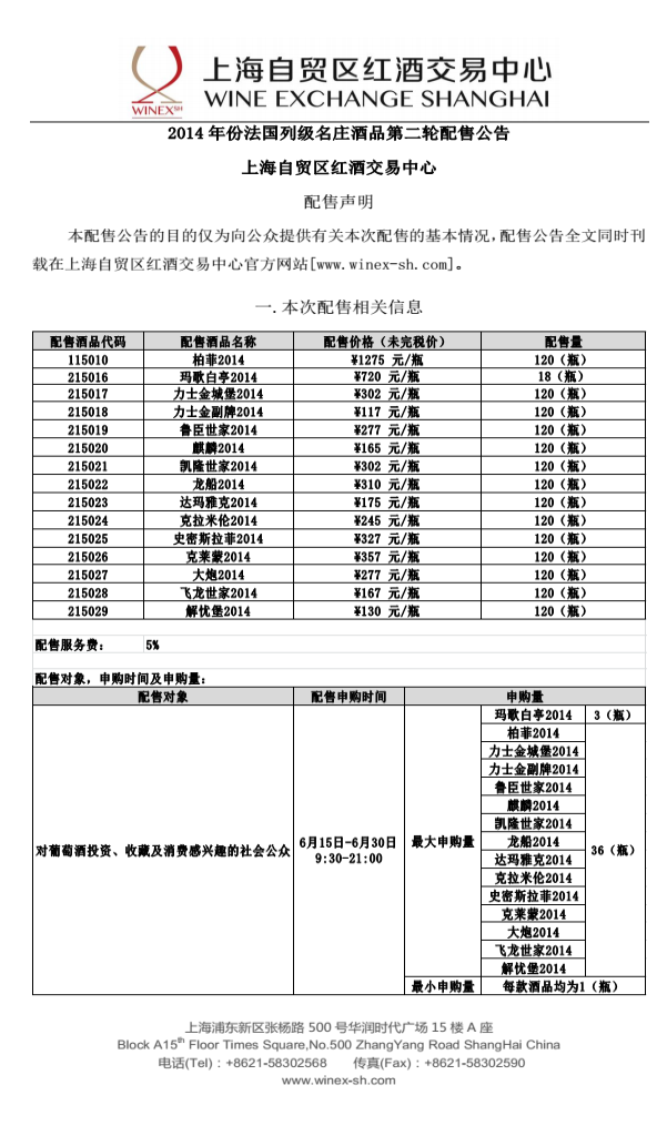 2014年份法国列级名庄酒品第二轮配售公告