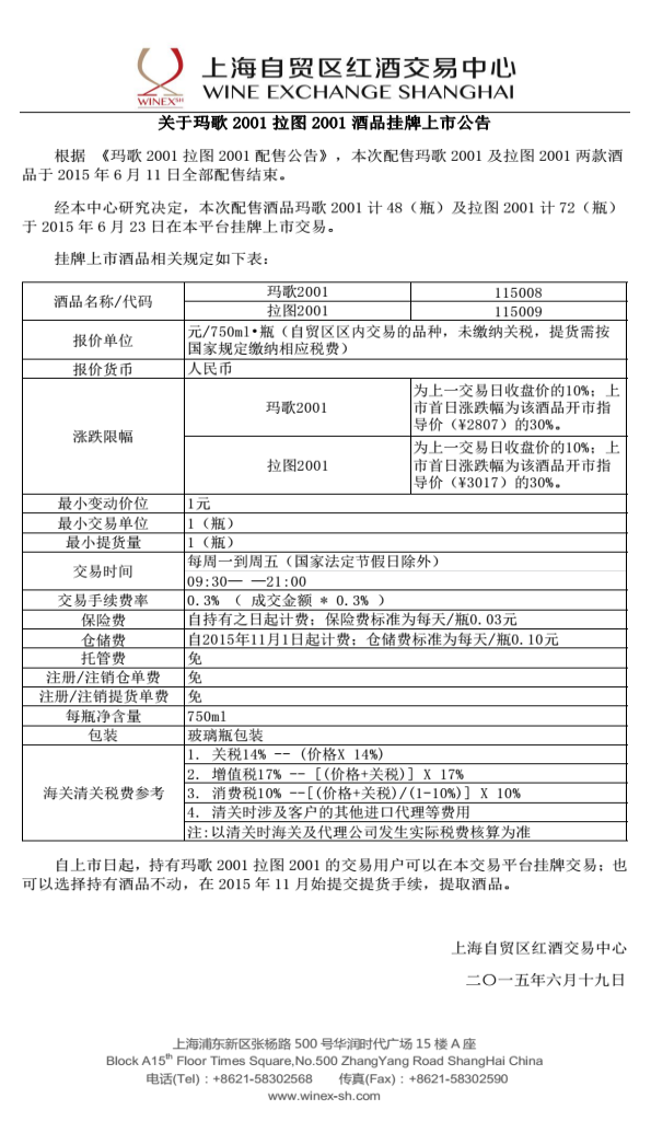 2015.06.19 拉图2004拉菲珍宝2010小拉图2008配售公告 上海自贸区红酒交易中心 配售声明 本配售公告的目的仅为向公众提供有关本次配售的基本情况,配售公告全文同时刊载在上海自贸区红酒交易中心官方网站[...