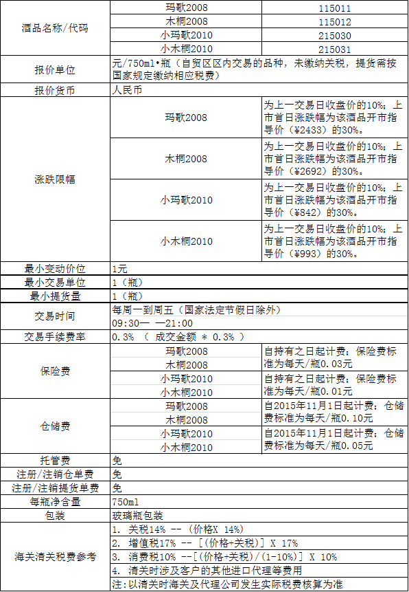 自上市日起,持有玛歌2008木桐2008小玛歌2010小木桐2010的交易用户可以在本交易平台挂牌交易;也可以选择持有酒品不动,在2015年11月始提交提货手续,提取酒品。