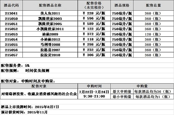 美人鱼2011凯隆世家2003凯隆世家2005小凯隆世家2011迪仙2009小迪仙2012马利哥2008拉格喜2007拉拉贡2010配售公告 上海自贸区红酒交易中心 配售声明 本配售公告的目的仅...