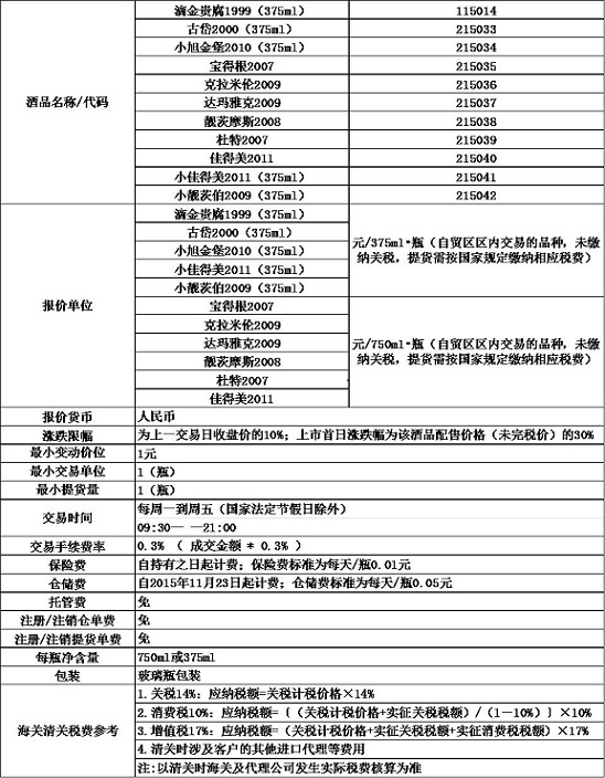 自上市日起,持有滴金贵腐1999(375ml)古岱2000(375ml)小旭金堡2010(375ml)宝得根2007克拉米伦2009达玛雅克2009靓茨摩斯2008杜特2007佳得美2011小佳得美2011(375ml)小靓茨伯2009(375ml)的交易用户可以在本交易平台挂牌交易;也可以选择持有酒品不动,在2015年11月始提交提货手续,提取酒品。