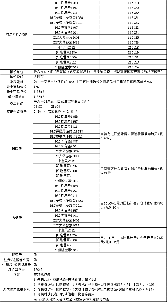自上市日起,持有DRC拉塔希1988、DRC拉塔希1997、DRC拉塔希2011、DRC罗曼尼圣维望1988、DRC罗曼尼圣维望2011、DRC李奇堡1997、DRC李奇堡2004、DRC大依瑟索2009、DRC大依瑟索2011、小宝马2012、凯隆世家1996、凯隆世家2000、凯隆世家2011及小凯龙世家2012的交易用户可以在本交易平台挂牌交易;也可以选择持有酒品不动在2015年12月始提交提货手续,提取酒品,其中持有DRC拉塔希1988、DRC拉塔希1997、DRC拉塔希2011、DRC罗曼尼圣维望1988、DRC罗曼尼圣维望2011、DRC李奇堡1997、DRC李奇堡2004、DRC大依瑟索2009及DRC大依瑟索2011酒品的交易用户限在香港提货。