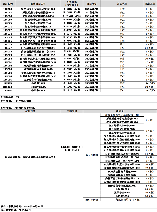 罗曼尼康帝大依瑟索特级1981红头勒桦伏旧特级2006双鸡比维纳巴塔蒙哈榭特级2011安娜葛鲁伏旧特级莫伯翠2013等酒品配售公告 上海自贸区红酒交易中心 配售声明 本配售公告的目的仅为向公众提...