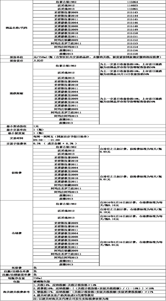 自上市日起,持有拉菲古堡1982、活灵魂2012、活灵魂2013、史密斯拉菲2009、史密斯拉菲2010、史密斯拉菲2011、克莱蒙教皇2004、克莱蒙教皇2008、克莱蒙教皇2009、克莱蒙教皇2010、克莱蒙教皇2011、阿玛庄珍藏2009、阿玛庄圣罗兰佐2011、阿玛庄阿玛2013、桑雅2011及桑雅2013的交易用户可以在本交易平台挂牌交易;也可以选择持有酒品不动,在2016年1月始提交提货手续,提取酒品。其中持有活灵魂2012酒品的交易用户在2015年10月16日挂牌上市日起可提交提货手续,提取酒品。