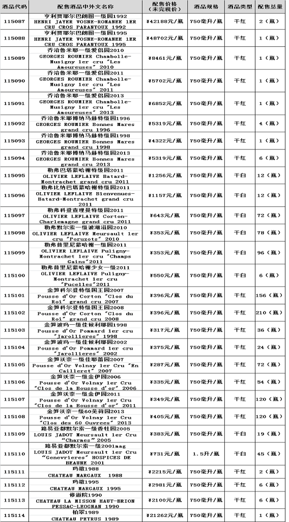 亨利贾耶尔巴朗图一级园1992乔治鲁米耶一级爱侣园2010勒弗巴塔蒙哈榭特级园2011玛歌城堡1988修道院城堡1990柏翠城堡1989等酒品配售公告