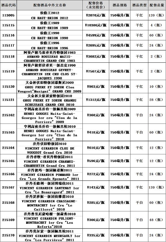 侯伯王1989阿曼卢梭马兹香贝丹特级园1983大金杯伏旧特级园慕斯尼2009亨利高夜圣乔治一级佩里埃2009乔丹伏旧特级园2010等酒品配售公告