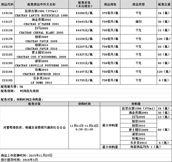拉菲古堡1986(375ml)滴金贵腐2001白马2005柏菲2009柏菲2010爱士图尔2009波菲2009玫瑰2010乐多美2010酒品配售公告