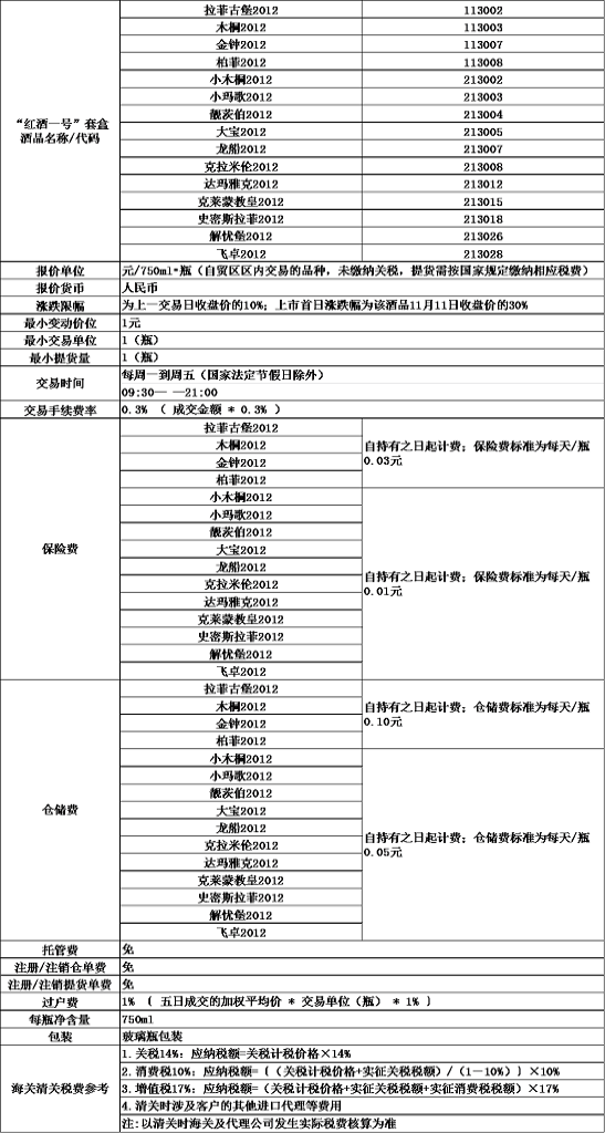 经本中心研究决定,本次配售法国列级名庄2012年“红酒一号”套盒酒品:拉菲古堡2012计4(瓶)、木桐2012计8(瓶)、金钟2012计8(瓶)、柏菲2012计4(瓶)、小木桐2012计4(瓶)、小玛歌2012计4(瓶)、靓茨伯2012计20(瓶)、大宝2012计20(瓶)、龙船2012计18(瓶)、克拉米伦2012计20(瓶)、达玛雅克2012计20(瓶)、克莱蒙教皇2012计18(瓶)、史密斯拉菲2012计6(瓶)、解忧堡2012计18(瓶)及飞卓2012计10(瓶)于2015年11月12日在本平台挂牌上市交易。