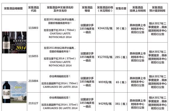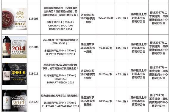 拉菲古堡干红2014(750ml)木桐干红2014(750ml)杜哈米隆干红2014(750ml)达玛雅克干红2014(750ml)克拉米伦干红2014(750ml)等酒品发售公告