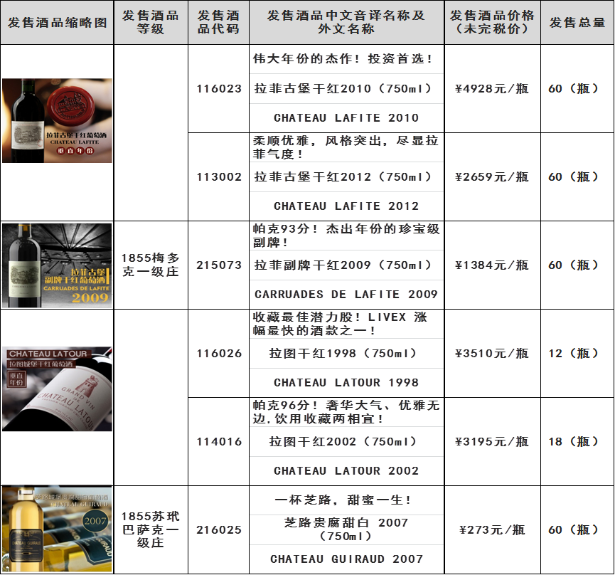 拉菲古堡干红1987(750ml)拉菲副牌干红2009(750ml)拉图干红1988(750ml)拉图副牌干红2008(750ml)芝路贵腐甜白 2007(750ml)等酒品发售公告 上海自贸区...