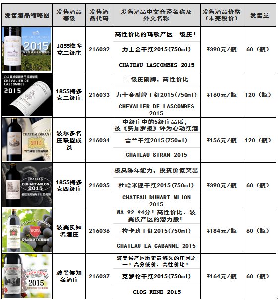 力士金干红2015(750ml)力士金副牌干红2015(750ml)雪兰干红2015(750ml)杜哈米隆干红2015(750ml)等酒品发售公告