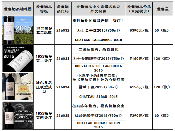 关于拉卡班干红2015(750ml) -酒品代码:216036和克罗伦干红2015(750ml)-酒品代码:216037提前结束发售的通知