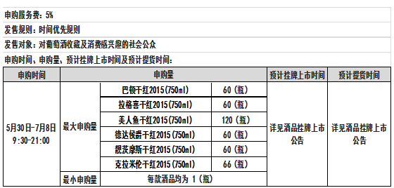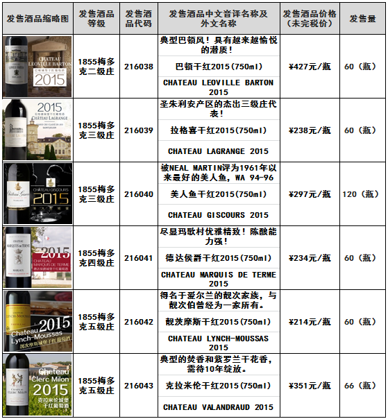 巴顿干红2015(750ml)拉格喜干红2015(750ml)美人鱼干红2015(750ml)德达侯爵干红2015(750ml)靓茨摩斯干红2015(750ml)等酒品发售公告