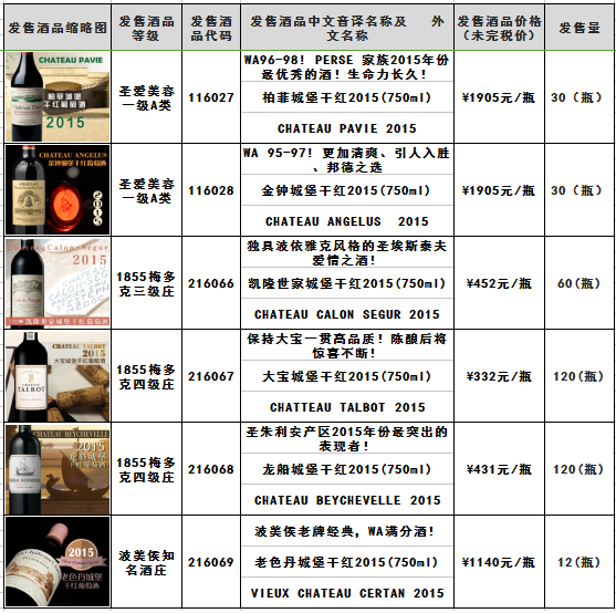 柏菲城堡干红2015(750ml)金钟城堡干红2015(750ml)大宝城堡干红2015(750ml)龙船城堡干红2015(750ml)老色丹城堡干红2015(750ml)等酒品发售公告