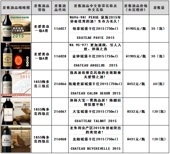 柏菲城堡干红2015(750ml)金钟城堡干红2015(750ml)大宝城堡干红2015(750ml)龙船城堡干红2015(750ml)老色丹城堡干红2015(750ml)等酒品发售公告 上海自...