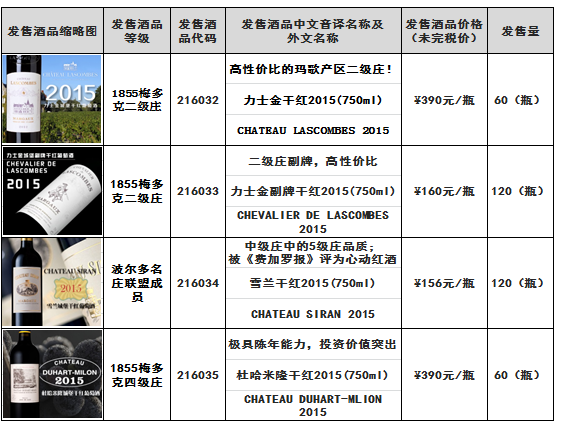 根据《力士金干红2015(750ml)力士金副牌干红2015(750ml)雪兰干红2015(750ml)杜哈米隆干红2015(750ml)等酒品发售公告》,下列酒品已于6月30日21时00分发售结束。