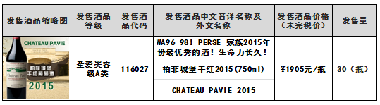 根据《柏菲城堡干红2015(750ml)金钟城堡干红2015(750ml)大宝城堡干红2015(750ml)龙船城堡干红2015(750ml)老色丹城堡干红2015(750ml)等酒品发售公告》,本次金钟城堡干红2015(750ml) -酒品代码: 116028;凯隆世家城堡干红2015(750ml) -酒品代码: 216066;大宝城堡干红2015(750ml) -酒品代码:216067;龙船城堡干红2015(750ml) -酒品代码: 216068;上述四款酒品均于7月22日11时34分全部发售结束。