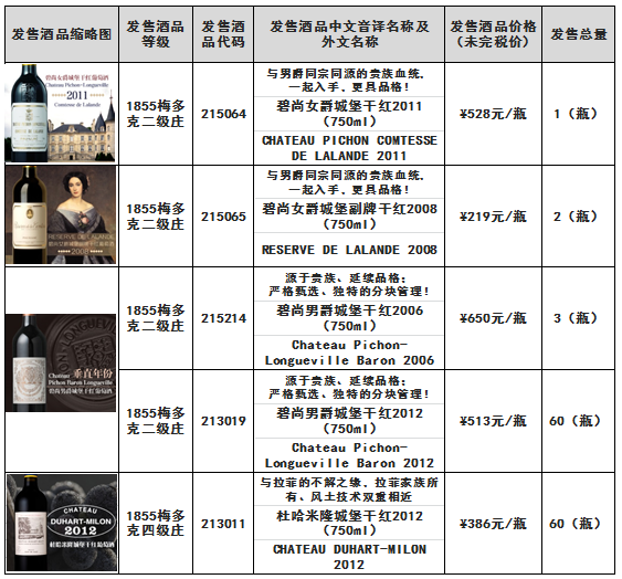 碧尚女爵城堡干红2011(750ml)碧尚男爵城堡干红2006(750ml)杜哈米隆城堡干红2012(750ml)克拉米伦城堡干红2002(1.5L)等酒品发售公告 上海自贸区红酒交易中心 发售...