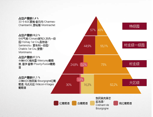 1936年AOC制度开始执行后,勃艮第便建立起了全法国最复杂详尽的分级系统。勃艮第酒的产量比波尔多酒要少,勃艮第酒的体系又要比波尔多酒复杂。