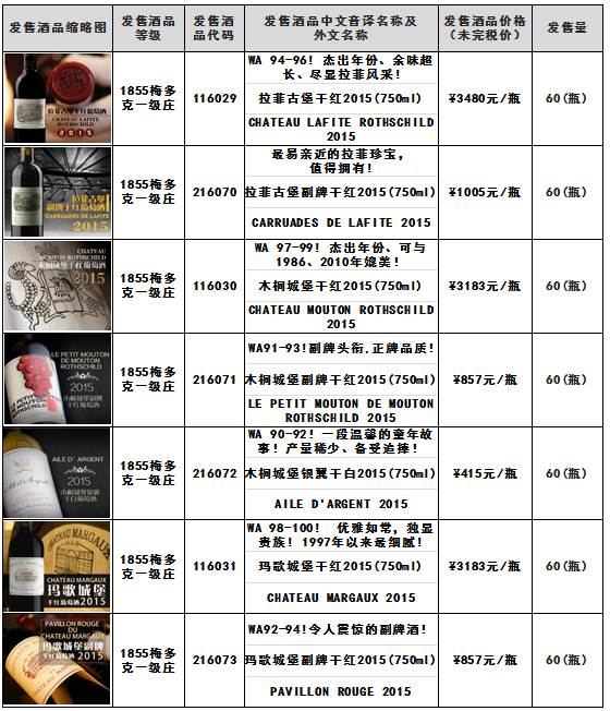 关于拉菲古堡干红2015(750ml) -酒品代码:116029木桐城堡干红2015(750ml)-酒品代码:116030等酒品结束发售的通知
