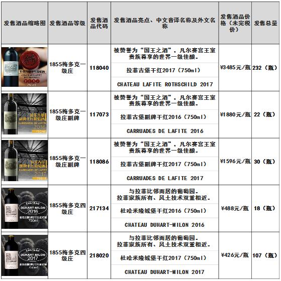 根据 《拉菲古堡干红2017(750ml)、拉菲古堡副牌干红2016(750ml)、杜哈米隆城堡干红2016(750ml)等酒品发售公告》 本次发售的拉菲古堡干红2017(750ml)-酒品代码118040、拉菲古堡副牌干红2016(750ml)-酒品代码117073等酒品(详见下述列表)于12月14日21时00分全部结束发售。